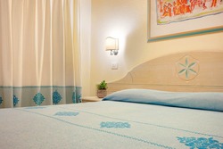DESCRIZIONE E SERVIZI:sorge su un’area privata protetta di oltre 5 ettari e dispone di 216 camere, tutte arredate in tipico stile sardo, suddivise tra camere Doppie, Triple, Quadruple (con letto a castello) e Bilocali Family Room, tutte con patio o veranda, dislocate in diverse villette al piano terra o in palazzine a due piani, circondate da una ricca vegetazione mediterranea. Camere Doppie: con due letti singoli o letto matrimoniale, sono dotate di patio o veranda attrezzati con tavolino, sedie, posacenere e stendi biancheria, servizi privati con doccia, asciugacapelli, set cortesia, aria condizionata a comando individuale, telefono, cassetta di sicurezza elettronica, minibar (consumazioni a pagamento), TV LCD. Camere Triple: con tre letti singoli o letto matrimoniale + letto singolo sono dotate di patio o veranda attrezzati con tavolino, sedie, posacenere e stendi biancheria, servizi privati con doccia, asciugacapelli, set cortesia, aria condizionata a comando individuale, telefono, cassetta di sicurezza elettronica, minibar (consumazioni a pagamento), TV LCD. Camere Quadruple: con letto matrimoniale + 1 letto a castello aggiunto, sono dotate di patio o veranda attrezzati con tavolino, sedie, posacenere e stendi biancheria, servizi privati con doccia, asciugacapelli, set cortesia, aria condizionata a comando individuale, telefono, cassetta di sicurezza elettronica, minibar (consumazioni a pagamento), TV LCD. Bilocali Family Room composti da doppio ambiente, unico servizio con doccia, con letto matrimoniale e letto singolo + camera con 2 letti singoli, sono dotate di patio o veranda attrezzati con tavolino, sedie, posacenere e stendi biancheria, asciugacapelli, set cortesia, aria condizionata a comando individuale, telefono, cassetta di sicurezza elettronica, minibar (consumazioni a pagamento), TV LCD.