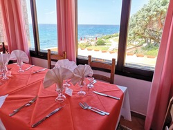 Spiaggia: splendida spiaggia di sabbia, a pochi metri dalla struttura, con piccola concessione attrezzata con ombrelloni e lettini ad esaurimento; fondale sempre sabbioso e non profondo per diverse decine di metri. Solarium in piscina e piattaforme sulla scogliera (accesso al mare tramite piccolo pontile in pietra), con libero utilizzo di ombrelloni, lettini e sdraio fino ad esaurimento.