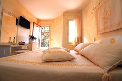 Sistemazione: 75 camere immerse nella macchia mediterranea con ingresso indipendente, distribuite in diverse file sul declivio che digrada verso il mare. Le camere più in alto, che si raggiungono tramite camminamenti e scalinate in pietra, godono di una vista mozzafiato sulla baia con tramonti spettacolari. Si dividono in doppie, matrimoniali, triple e quadruple con letto a castello. Dispongono tutte di tv, mini-frigo, cassaforte, aria condizionata, ventilatore a pale, servizi privati con doccia e asciugacapelli. Sono disponibili camere per ospiti diversamente abili.